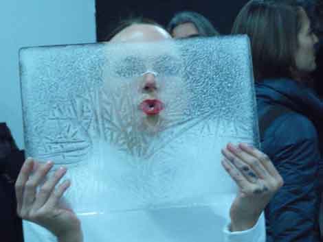 Dans la performance Breath, Saskia Edens utilise une plaque de glace et ses lèvres maquillées de rouge. L'union de la chaleur et du froid, de l'artiste et du public permettra une percée. Saskia Edens nous invite à regarder les sons.